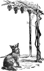 Една изгладняла лисица видяла да висят от една лозница узрели черни гроздове. Тя опитала всичките си хитрини, за да се добере до тях, но усилията й били напразни, тъй като не можела да ги достигне. Накрая се отказала, но скрила разочарованието си и заявила: