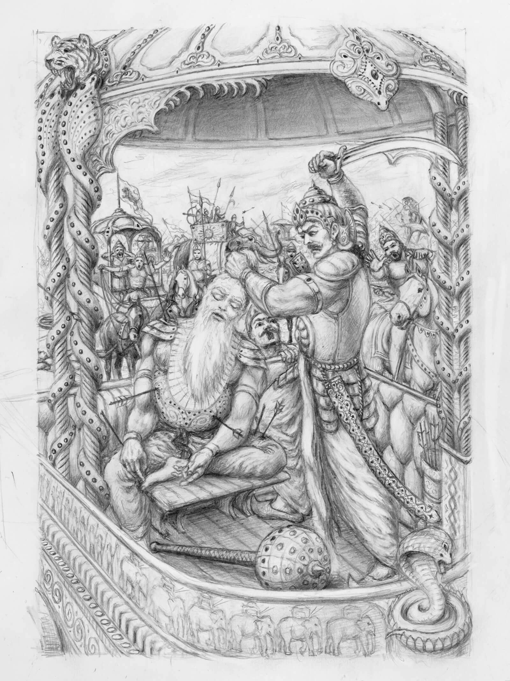 Междувременно Бхима обезумя от ярост, виждайки как Дрона унищожава армията на Пандавите. Той се приближи към Дхрищадюмна и му заговори сурово: „Кой мъж, който счита себе си за кшатрия, ще стои отстрани и ще гледа как убиват синовете и баща му? След като изрече страшната си клетва в събранието на царете, защо сега не я изпълняваш? Ето там стои твоят заклет враг, подобен на свещен огън, чийто пламъци са стрелите и копията, а телата на хората са възлиянията в него. Не го ли убиеш, ще го направя аз. Отдръпни се. На мига ще изпратя този стар брамин в обителта на Ямараджа.“