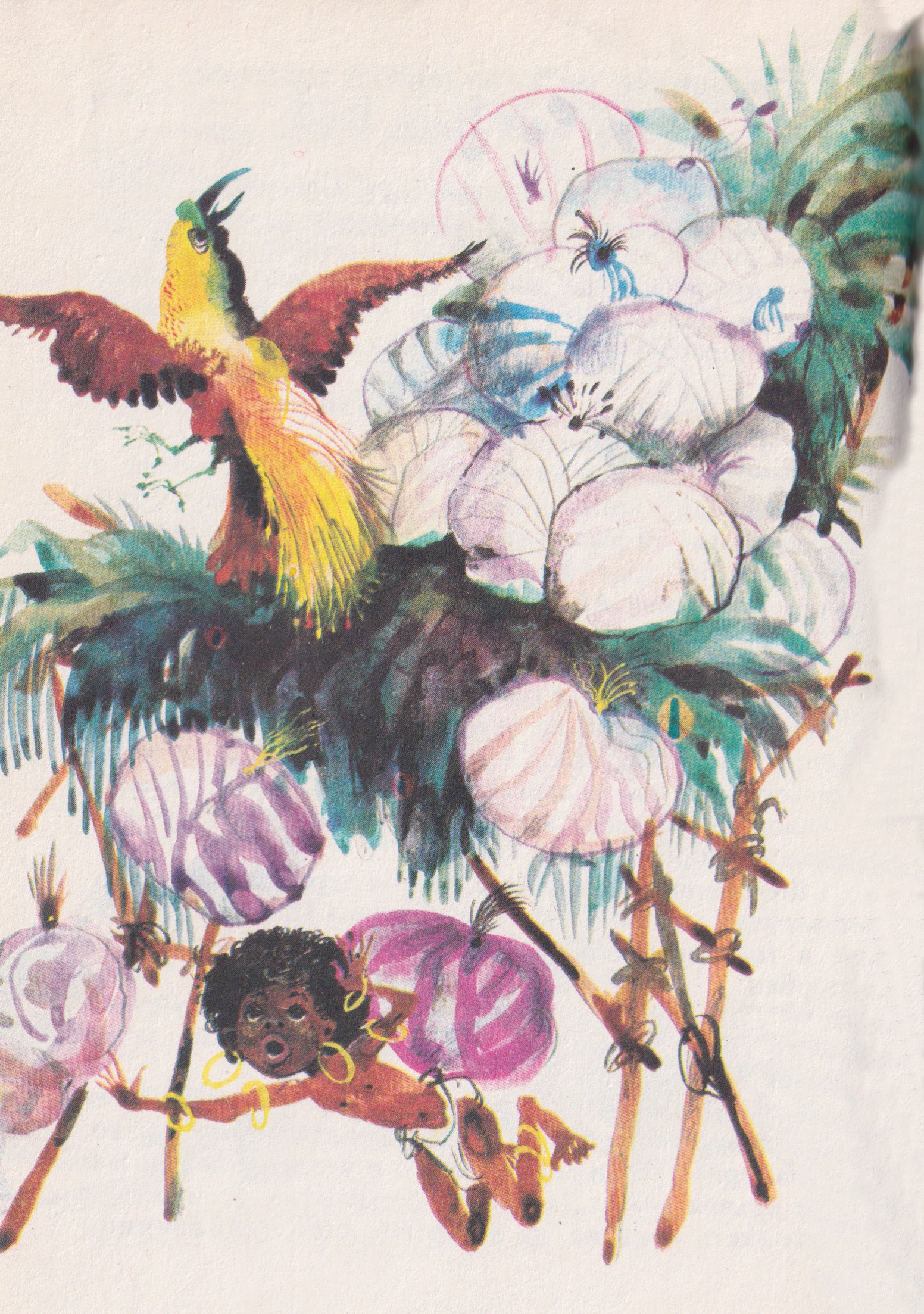 Шествието се проточи откъм джунглата, обиколи училищните колиби, мина покрай двореца и заприлича на гердан — гердан от деца, биволи, цветя и корали. Възрастните се трупаха наоколо и не можеха да се нагледат. И викаха един през друг: