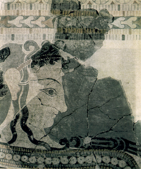 19. „Танцьорът с бика“. Частично реставрирана фреска от източното крило на двореца в Кносос, около 1500 г. пр.н.е.