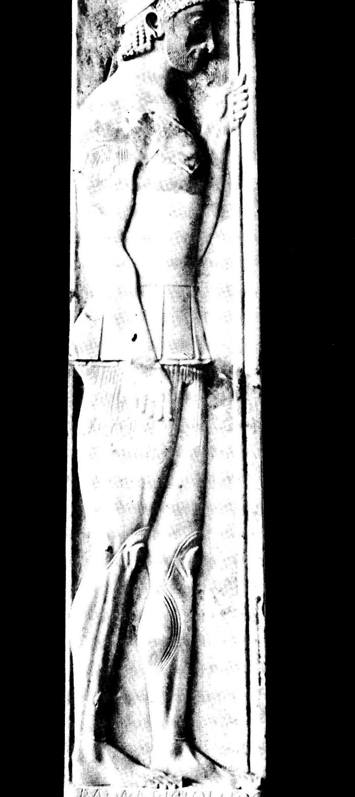 Ил.53 Погребална стела на атинянина Аристион. Долу се чете подписът с архаични букви: „Работа на Аристокъл“ (към 520–510 г.). Върху къдравата си коса хоплитът носи вдигнат „коринтски“ шлем (една част е счупена). Над тънкия хитон има броня, удължена с кожени парчета. Носи наколенници и държи копието си с лявата ръка. Много от детайлите са само нарисувани и от тях са останали следи. (Национален музей, Атина).
