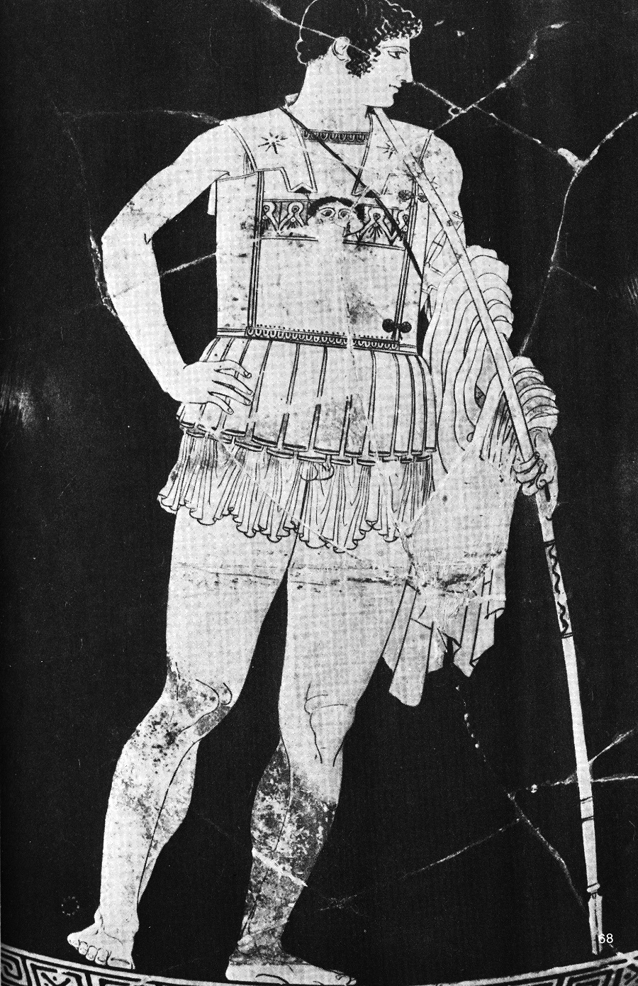 Ил.68 Ахил. Атическа червенофигурна амфора, датираща от третата четвъртина на V в. (съвременница на Партенона). Изобразен е Ахил като хоплит от онова време, без шлем и щит. Той носи броня, удължена с кожени ивици и закрепена на раменете с презрамки. На гърдите му — образът на Горгона. Няма наколенници. Героят държи в лявата ръка дълго копие, подсилено в (средата на долния край с метално острие за забиване в земята). Мечът, чиято дръжка се подава изпод лявата му мишница, е окачен на къс ремък. (Музей на Ватикана).