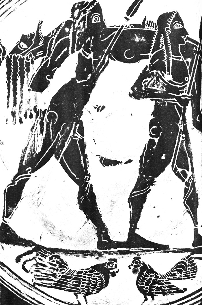 Ил.69 Тройният герион. Атическа чернофигурна амфора (третата четвъртина на VI в.). Противникът на Херакъл е със стройно тяло на хоплит. Неговото куче-чудовище е двуглаво. Рисунката дава възможност да се видят добре двете страни на кръглия щит, който се е употребявал в гръцката войска. От външната страна рисувана или релефна емблема с магическа сила, тя трябвало да изплаши неприятеля и да отклони лошите удари (тук емблемата е глава на Силен). Вътрешната страна на щита е с подплата (понякога рисувана или везана), върху която са закрепени метални или ремъчни дръжки — една по средата на щита, през която боецът провирал ръката под лакътя, и друга, до ръба, която хващал с ръка. (Национална библиотека, Кабинет за медали, Париж).