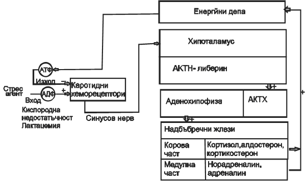 Схема: Кибернетичен модел на стрес (Маджаров И., Стресът при животните- мит и действителност, Земиздат, София, 1988)