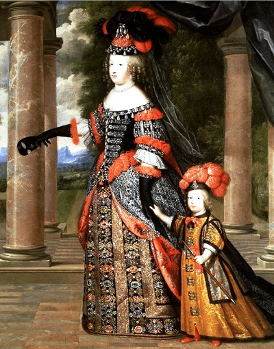 Мария Терезия Австрийска (1638–1683) е дъщеря на Филип IV Испански от първата му жена, Елизабет Френска. Бракът й с Луи XIV, отпразнуван в Сен Жан дьо Люз на 9 юни 1660 г., е скрепил Пиренейския договор между Франция и Испания (7.11.1659 г.) и въдворил мир в отношенията между двете държави. Братята Бобрьон наследили Веласкес като портретисти на младата жена. Тържественото влизане на височайшата двойка в Париж на 26 август било повод за ненадминато разточителство и блясък. Кралица дала живот на шест деца три момичета и три момчета — от които само първородният син, Големият дофин Луи, роден през 1661 г., стигнал до зряла възраст. Твърде малко се знае за ежедневието на тази незабележима владетелка, с изключение на шепа детайли, като навика й да пляска с ръце сутрин, когато била прекарала нощта с краля, предпочитанието към шоколада и страстното увлечение по игрите, благочестието й, подхранвано от многобройните кралски фаворитки, или лошия й френски. Тя почти не се задържала във великолепния си апартамент, разположен в южната част на двореца Версай, на първия етаж в централния корпус, симетрично на покоите на краля. Мария Терезия била дискретна, лишена от политически амбиции, умеела да бъде на нивото на положението и дълга си — придружавала Луи XIV на военни походи, по-специално във Фландрия през 1667 г., по време на Деволюционната (френско-испанска) война, когато суверенът претендирал, че отстоява наследствените права на съпругата си.