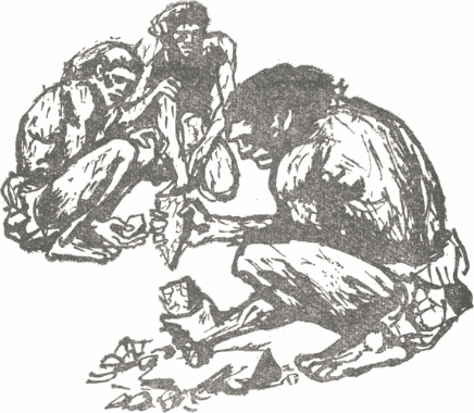 Джар внимателно наблюдаваше точно пресметнатите бързи и ловки движения на стария вожд — Маюм изработваше каменен връх на копие. Юношата изпита желание да направи същото. Рам се мъчеше да измайстори стъргачка, едно от най-разпространените каменни оръдия по онова време — полукръгъл нож с остри краища, приспособен главно за остъргване на кожи. Той работеше без голямо желание. Обработваше камъка грубо.