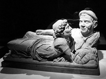 Етруски саркофаг. Тази силно натуралистична скулптура, изобразяваща дълбоко замислени съпрузи, датира от ок. 300 г. пр.Хр. Използването на керамика (глина) вместо камък позволявало по-добро моделиране; така етруските постигали изумителни визуални ефекти..