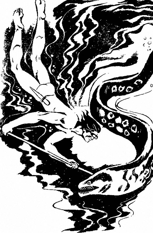 Ето, мурената попритихна, отпаднала от борбата, изтощена от изтеклата кръв. Хрилните й капачки се надигаха и отпускаха често. Разбрал, че кислородът не й достига, човекът се изви ловко и без да изпуска копието от лявата си ръка, с дясната заби ножа си в темето й. Но и тоя удар не се оказа смъртоносен. Стоманено пъргавото тяло отново се заогъва като откачена пружина.