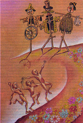 Момчето от подиума извикваше все по-гръмко своите заклинателни думи, а хорът го повтаряше по същия начин, докато накрая всички закрещяха оглушително. Тогава момчето посочи с гневен жест плашилата и децата като побеснели се нахвърлиха върху тях. Ритаха ги, обсипваха ги с юмручни удари, ръфаха ги със зъби, изтърбушваха тревните им кореми и глави.