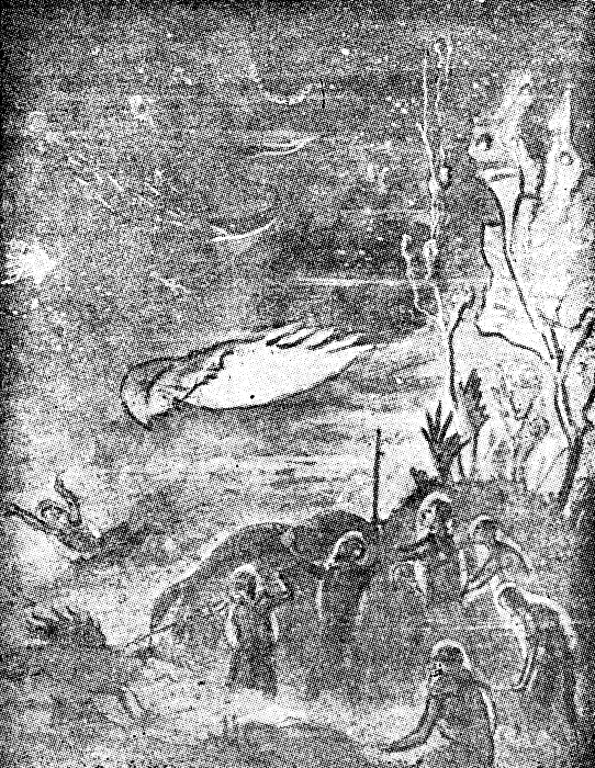 Спуснахме се по стъпалата и вървяхме по края на подводните джунгли, които растяха в подножието на базалтовите скали, когато Менд развълнувано посочи нагоре и замаха с ръцете си на един от атлантите, който се беше отделил от групата и вървеше отстрани по открито място. В същата минута атлантите се хвърлиха към един голям объл камък, завличайки и нас със себе си. Едва след като се намерихме под прикритието на камъка, узнахме за причината на внезапната тревога.