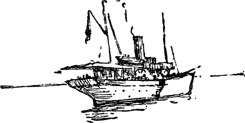 Леко затънал в меката тиня, пред нас лежеше върху страната си голям кораб. Коминът му беше свален, грос мачтата беше счупена почти в основата си, но в останалата си част корабът беше незасегнат и беше така чист, като че ли току-що беше излязъл от док. Побързахме да го обиколим и се намерихме пред кърмата му. Вие можете да си представите с какво чувство прочетох неговото име: