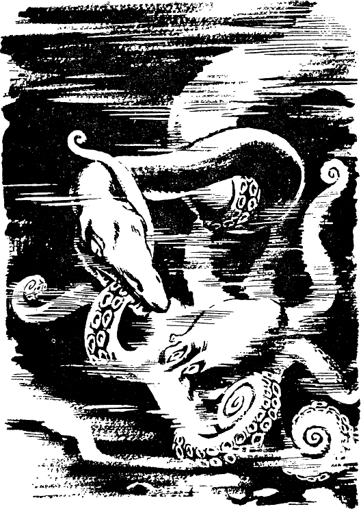 Няколко минути огромното мекотело се мяташе безпомощно по дъното, а пипалата му продължаваха да се усукват в конвулсивни движения, докато огънят в изпъкналите му жестоки очи угасна напълно.