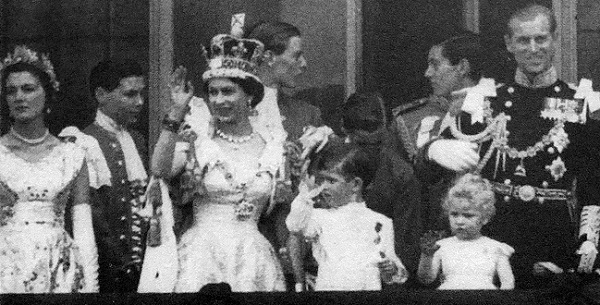 Заобиколена от семейството си, Елизабет II маха на своите поданици от балкона на Бъкингамския дворец в деня на коронацията (2 юни 1953 г.). След наложения от войната четиринадесетгодишен режим на строги икономии, реконструкции и ограничения Англия похарчва 300 милиона долара през седмицата на събитието. Роклята на кралицата струва на правителството й 1 милион.