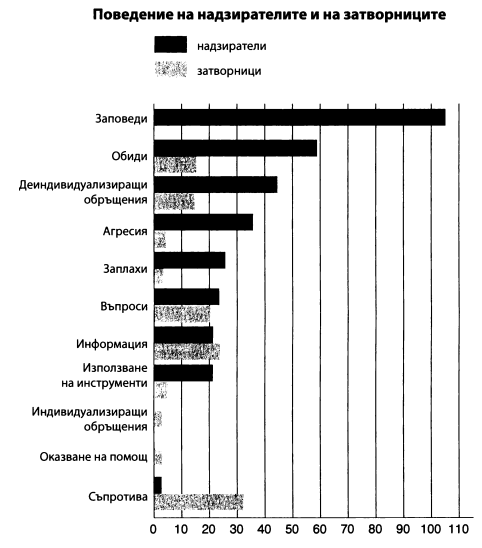 Както е показано на фигурата, обобщаваща тези резултати, като цяло имаше прекомерно много отрицателни, враждебни взаимодействия между надзирателите и затворниците. Себеутвърждаващата активност до голяма степен беше прерогатив на надзирателите, докато затворниците по принцип приемаха относително пасивна поза. Най-характерни за надзирателите в различните ситуации, които бяхме записали, са следните реакции: издаване на заповеди, обиждане на затворниците, деиндивидуализиране на затворниците, демонстриране на агресия срещу затворниците, заплашване и използване на инструменти срещу тях.