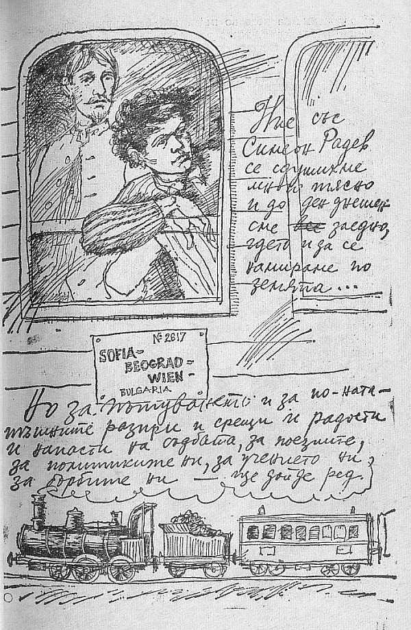 Влакът потегли и ние с него към Европа, кой с куфарче, кой с бохчичка, кой — ей така на̀, както си вървеше из софийските улици. Симеон Радев — за Дижон, Кръстьо Бояджиев — за Лиеж, друг врачанец, Никола Костов, за Виена — архитектура, моя милост — за Лайпциг…
