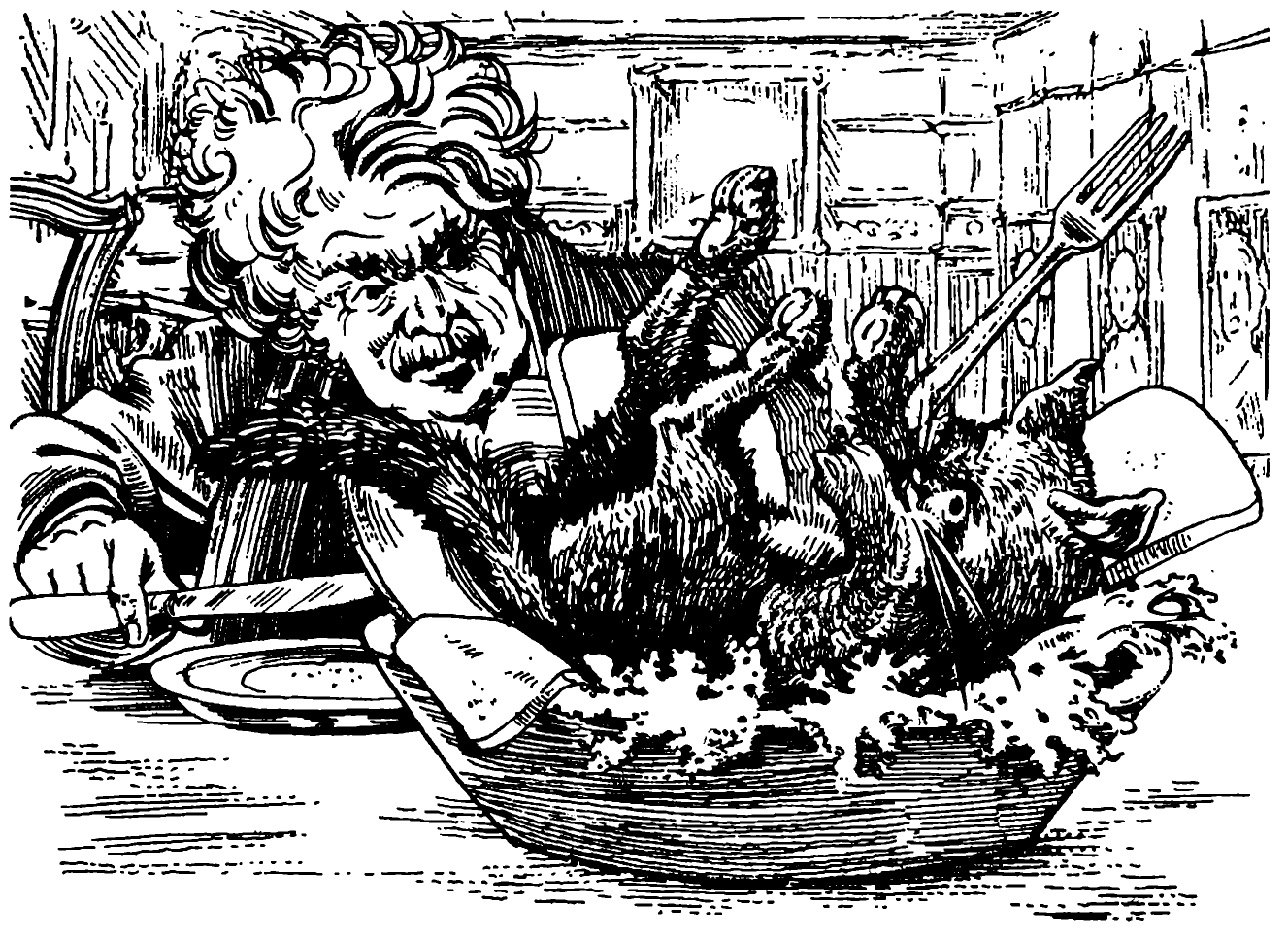 „Пляяяс!“ — и професорът видя скромния си обяд захлупен от лапите на голям риж котарак. Котаракът беше долетял някъде от небето, ала не изглеждаше пострадал от внезапното приземяване — мигом разтърси глава, помириса чинията и незабавно отхапа половината от розовото парче.